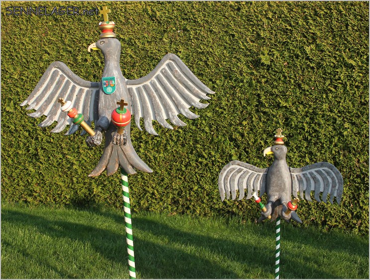 Das Bild zeigt den Königsadler, auf den beim Vogelschießen am 14. Mai geschossen wurde und den Jungschützenkönigsadler, auf den am Schützenfest-Sonntag (29. Mai) geschossen wird. Die Adler wurden von Leo Mays gefertigt.
