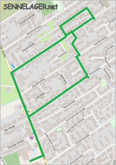 Wir starten um 14 Uhr vom Schützenplatz Sennelager nach links auf die Bielefelder Straße Richtung Hövelhof, biegen dann rechts in den Infanterieweg ein und gehen bis zur Hausnummer 48a (Königsresidenz). Nach einem kurzen Stopp, geht es weiter nach links in die Ulanenstraße und an der nächsten Einmündung links zum Infanterieweg, dann links auf den Infanterieweg und direkt rechts in die Siedlung Kavallerieweg, dann rechts und wieder links in die Roonstraße, danach rechts auf den Pionierweg in Richtung Bielefelder Straße, auf der Bielefelder Straße dann wieder nach links Richtung Schloß Neuhaus und zurück zum Schützenplatz.